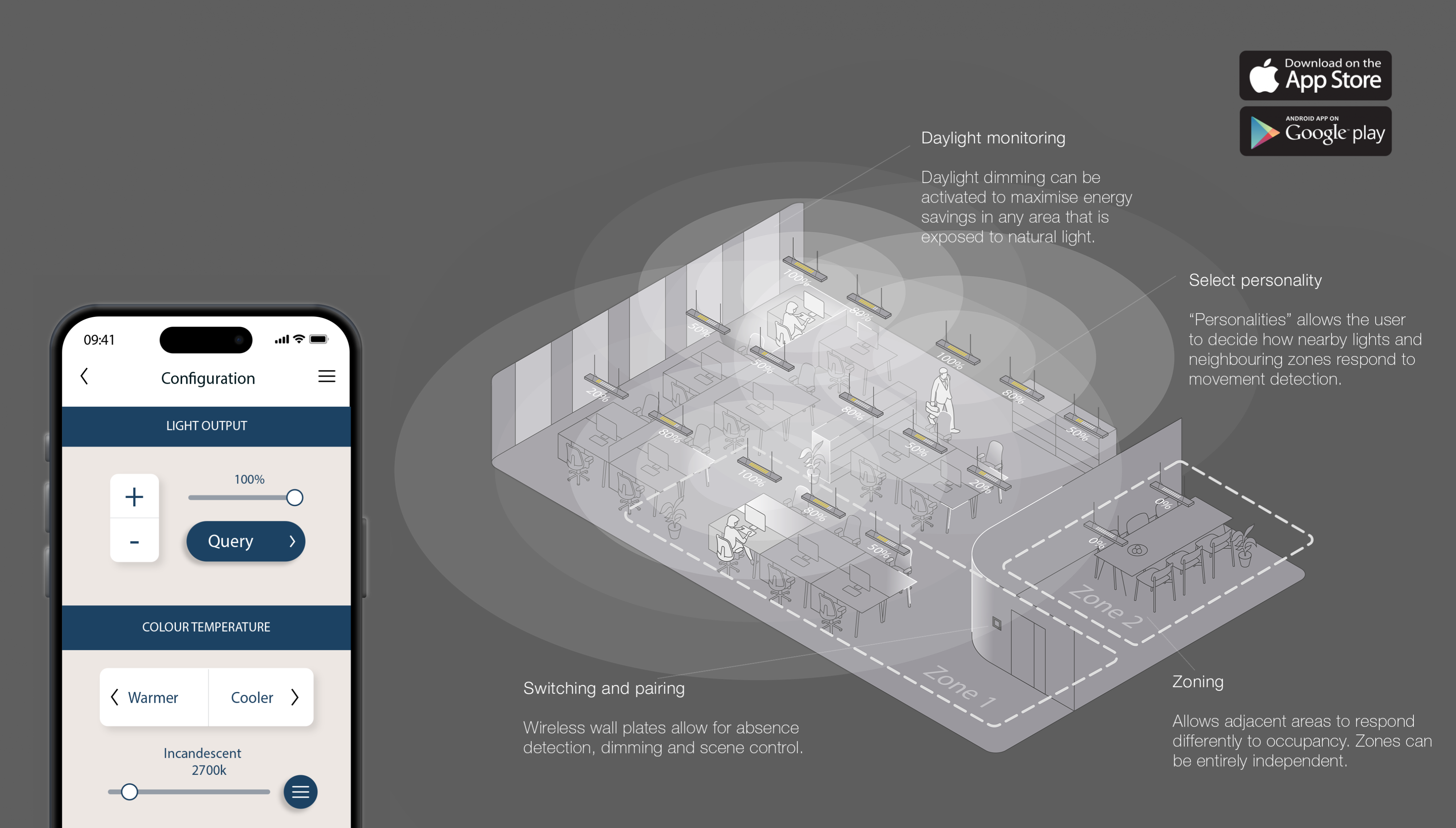 The use of intelligent wireless controls allows for a highly flexible and scalable system, enabling integration into wider building management systems and the ability to re-configure the lighting functionality to suit the usage of the building without costly and time consuming external commissioning.
