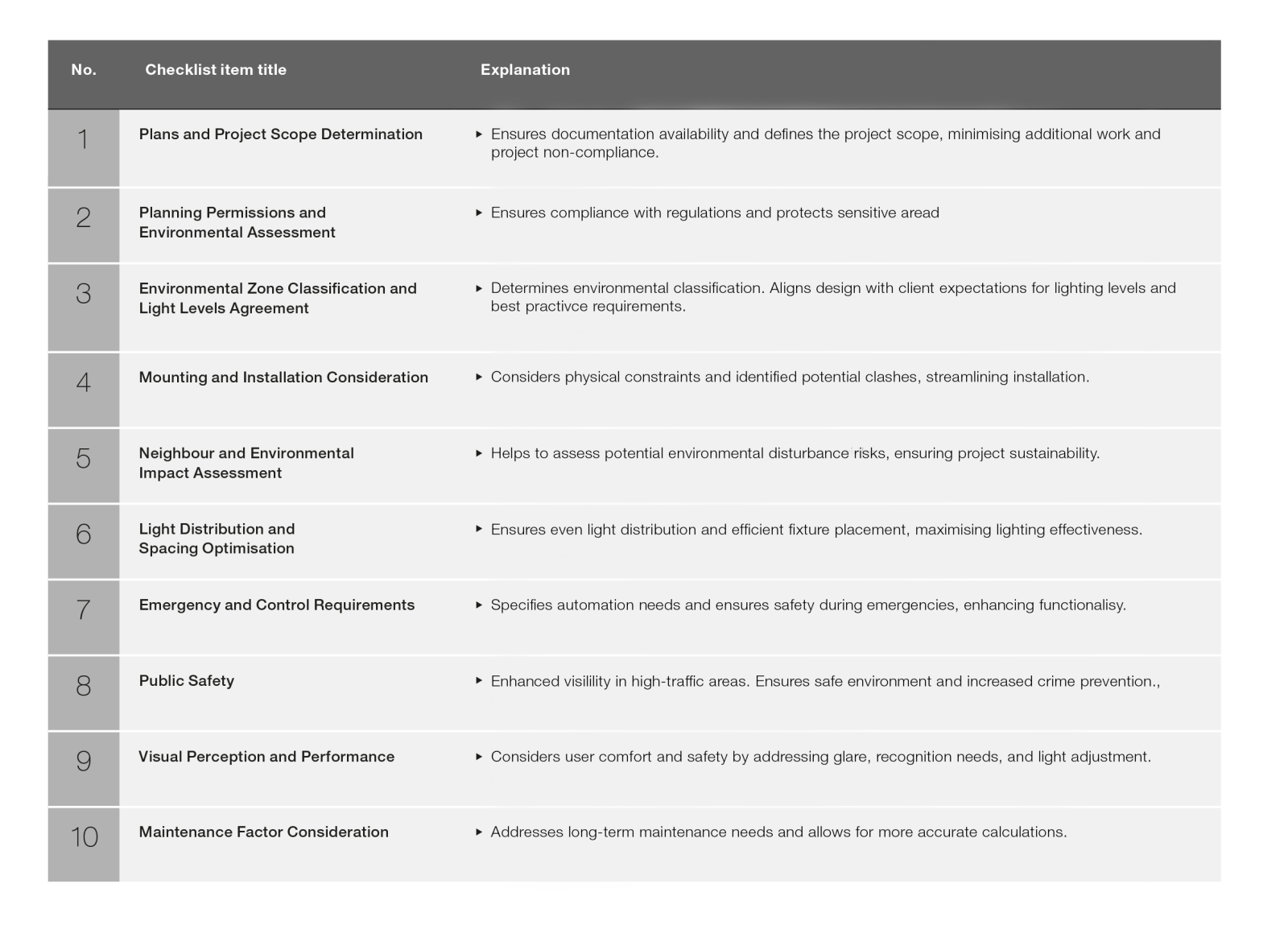 Responsible external lighting design doesn’t have to be overly complex. To make the process easier we’ve created a simple, user-friendly checklist that ensures all key requirements are met. By following this guide, anyone can achieve a thoughtful and effective lighting scheme that balances functionality, safety, and environmental responsibility—resulting in a design that truly shines.